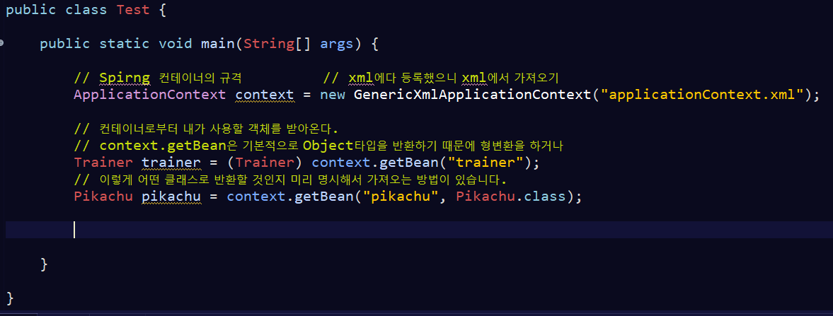 26번째 라인은 context.getBean()으로 가져온 Object 객체를 내가 사용할 객체로 형변환 하여 가져오는 것이고