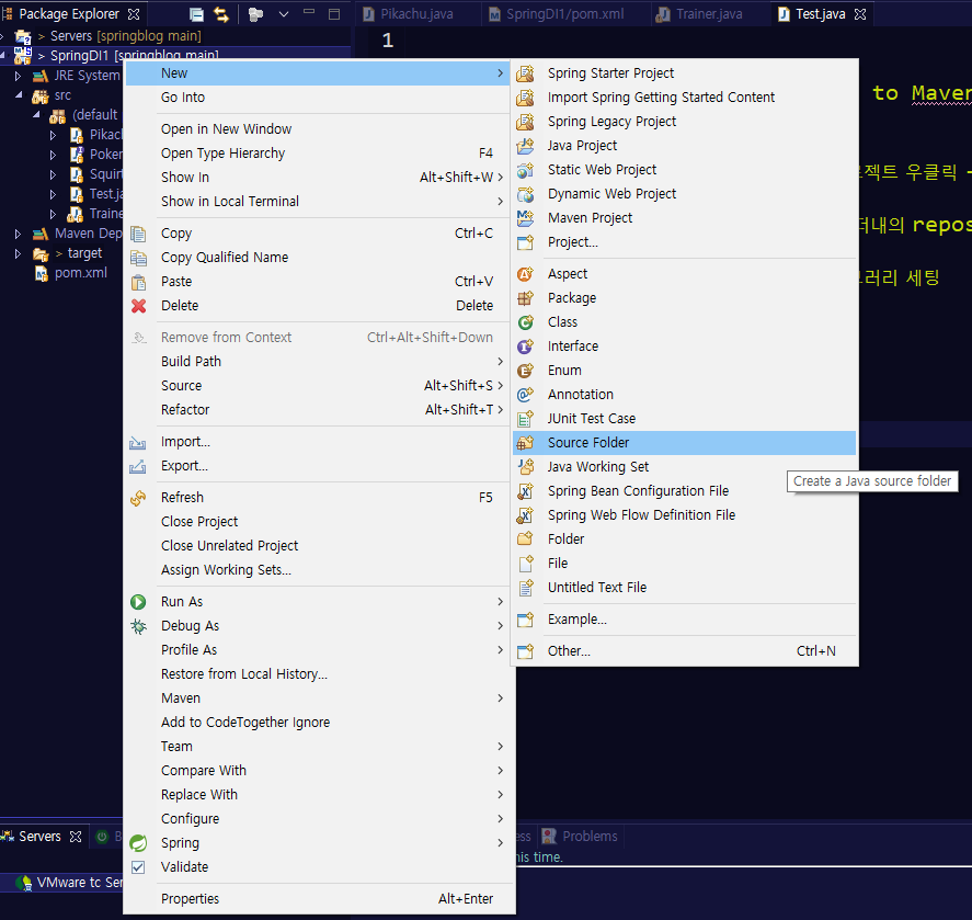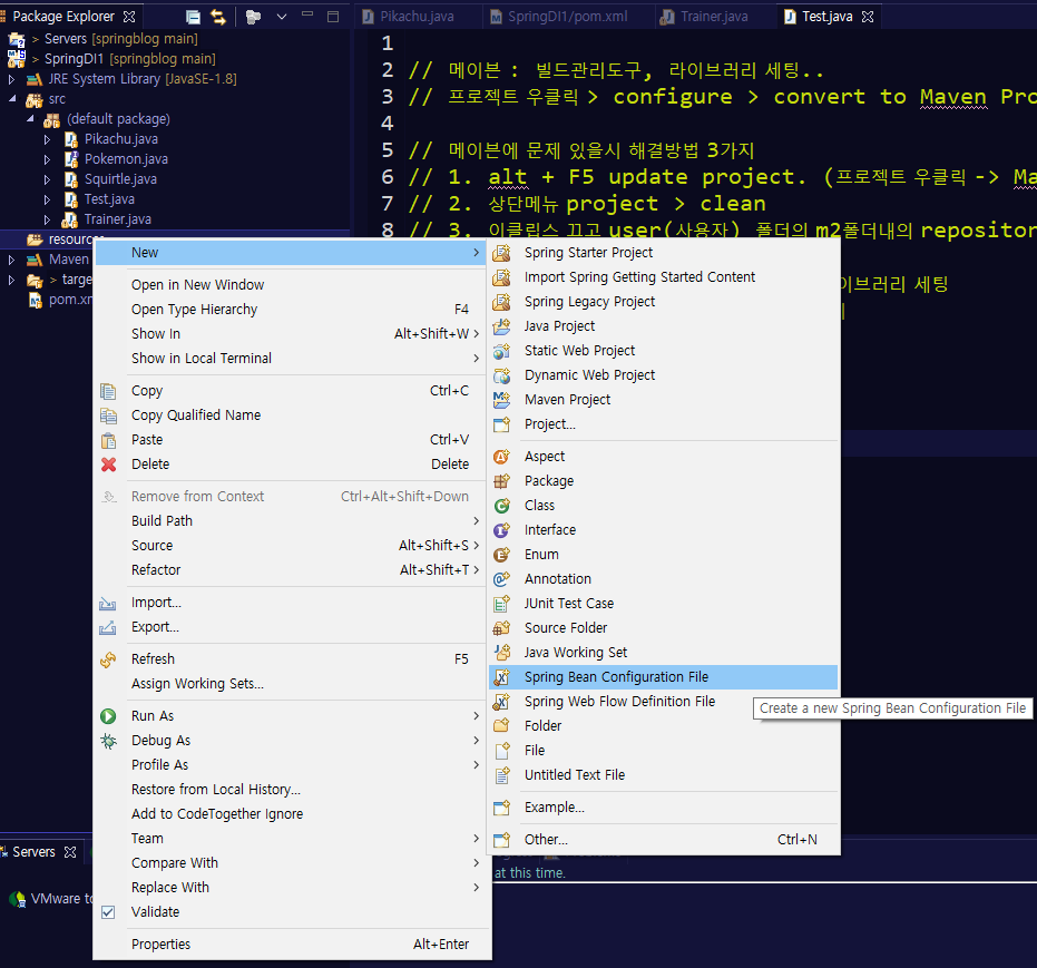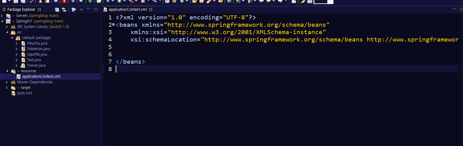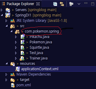 일단 default package로 만들어 놓은 파일들을 com.pokemon.spring 패키지를 하나 만들어서 넣어두고 갈게요
