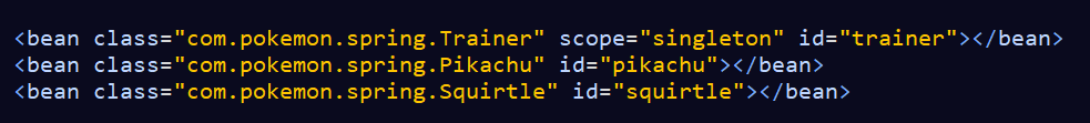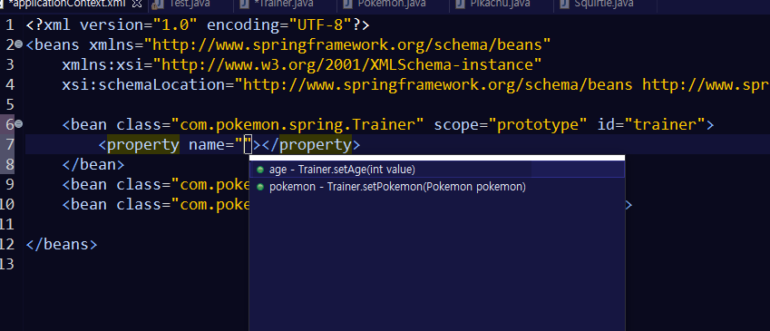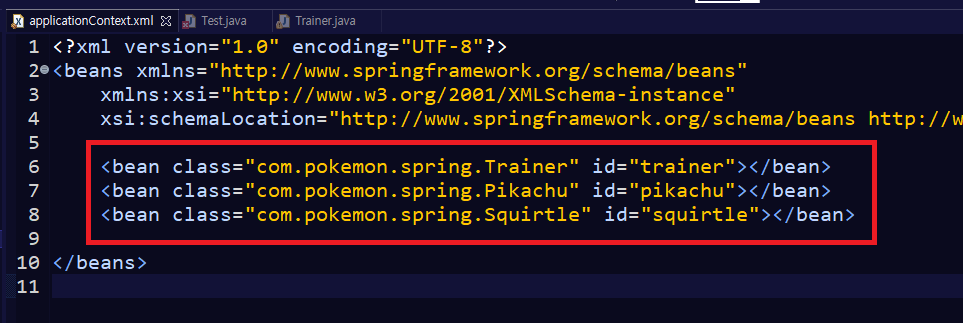 한 가지 팁을 드리면 <bean class="Pikachu"></bean>을 작성하고 Pikachu에 커서를 두고 Ctrl+Space로 자동완성을 시키면 풀패키지 명이 입력됩니다.