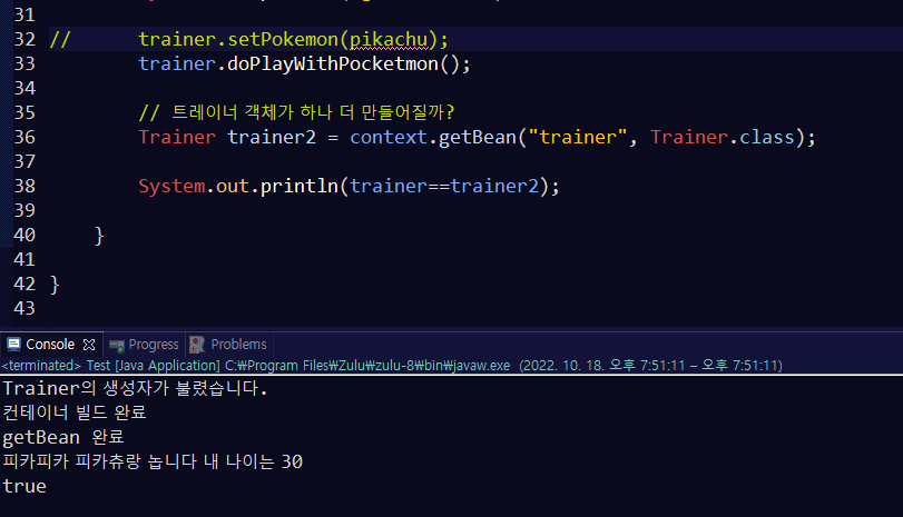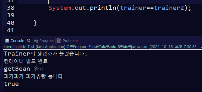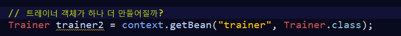 트레이너 객체를 getBean으로 한 번 더 가져오면 이 trainer2는 먼저 만든 trainer과 같은 객체일까요 다른 객체일까요?