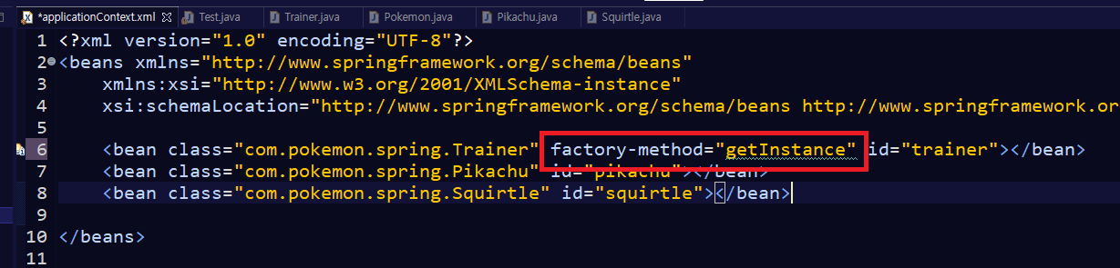 그러면 factory-method라는 속성을 추가해줘서 생성자 대신에 저 메소드를 통해 객체를 만들겠다고 설정해 주면 됩니다. 자주 쓰지는 않아요