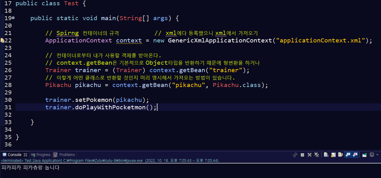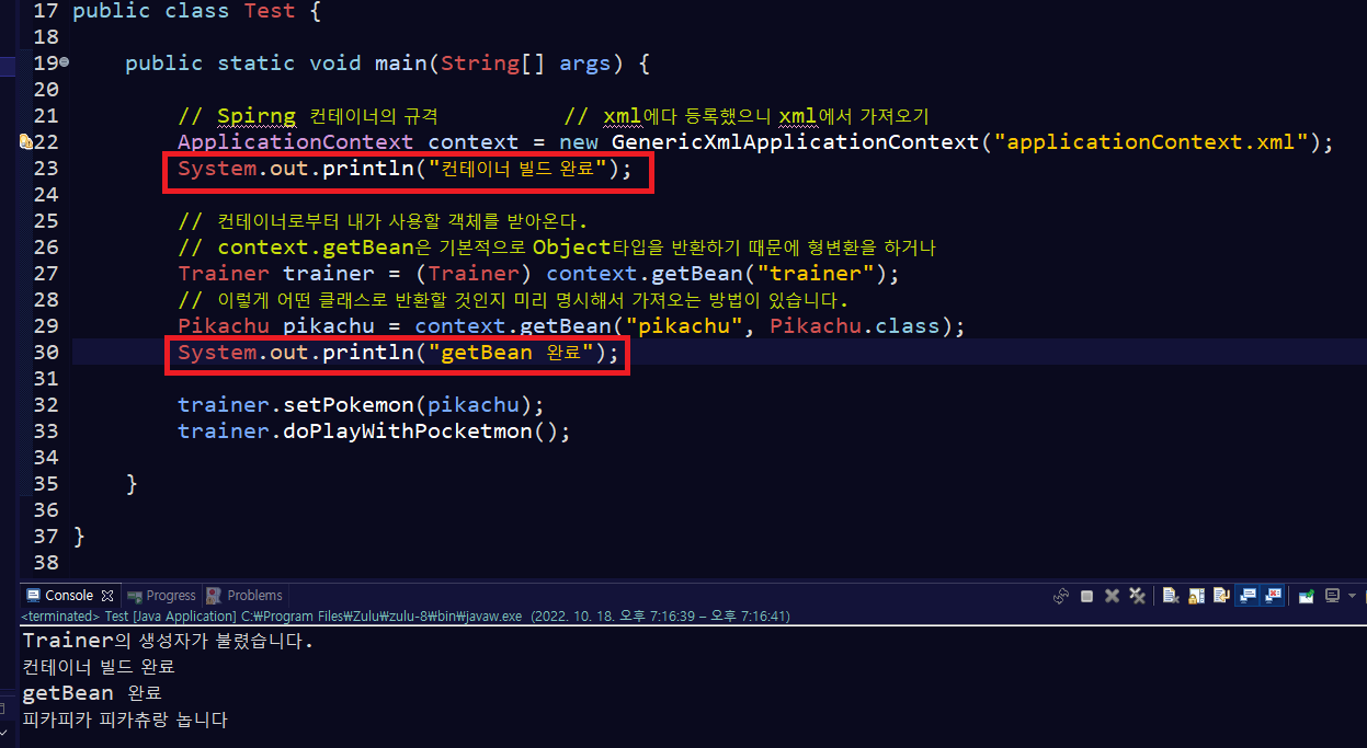먼저 22번째 라인은 우리가 xml 파일에 bean 객체를 등록했으니 등록한 객체를 Spring 컨테이너에 담아두는 작업입니다.
