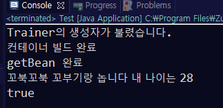 마치 Trainer에 lazy-init 속성을 적용한 것처럼 getBean()을 할 때 new가 되고 또 lazy-init과는 다르게 맨 처음에만 new가 되는 것이 아니라 getBean()을 할 때 마다 new가 되는 것을 볼 수 있습니다.