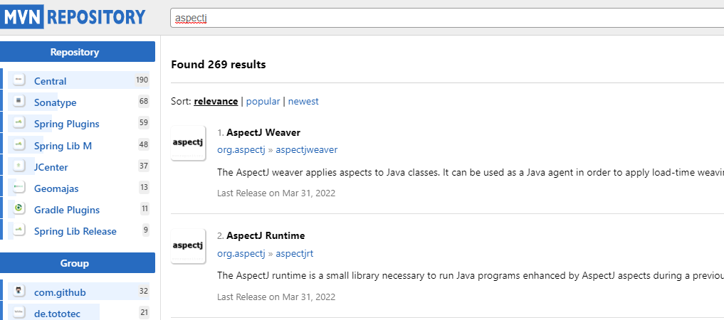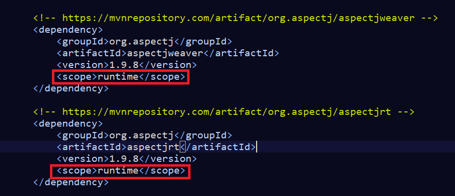 그 다음에는 AspectJ를 검색해서 Weaver와 Runtime 두 개를 다 가져오세요