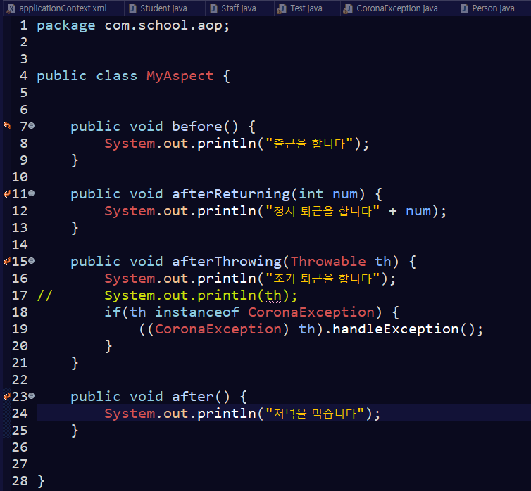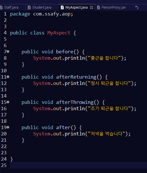 이번에는 MyAspect라는 클래스를 만들고 공통관심사항을 구현할게요