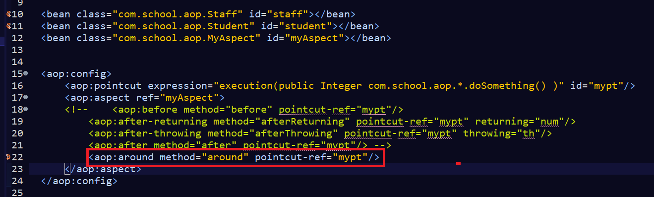 13, 21번째 줄의 <aop:config>는 여기는 aop 설정하는 곳이다 라고 선언하는거라 생각하시면 됩니다