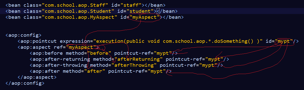 16,17,18,19번째 줄의 pointcut-ref에는 위에 설정한 포인트컷을 기준으로 실행된다는 뜻입니다