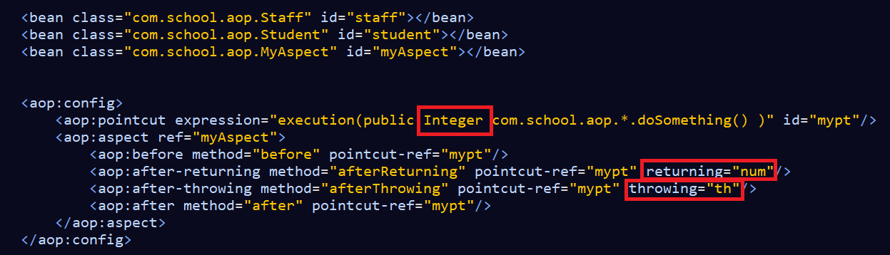 xml에서는 빨간 박스 부분을 수정하시면 됩니다 returning이랑 throwing 뒤에는 pointcut에서 던지는 매개변수를 어떤 이름으로 받을지가 나와있어요