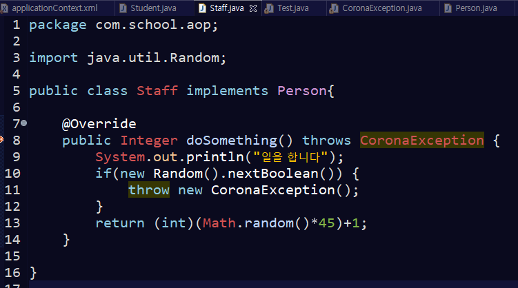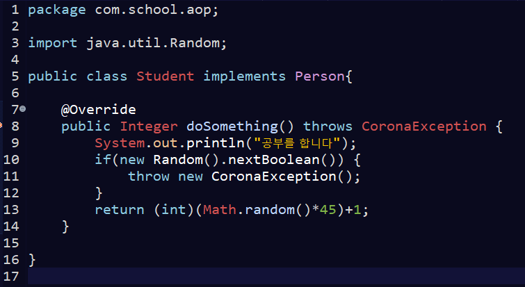 그러면 예외를 하나 만들어서 실험 해보고 이번에는 Pointcut에 들어가는 메소드의 반환타입이 void가 아니라 Integer인 경우를 한번에 살펴볼게요