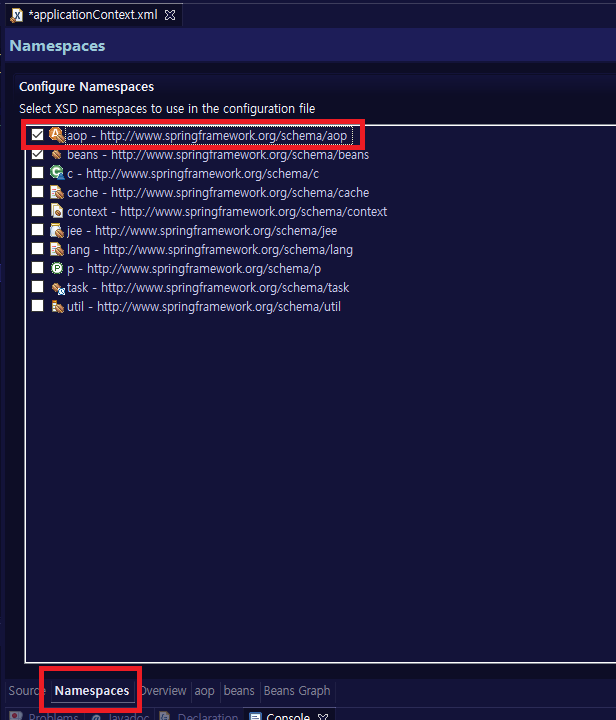 네임스페이스로 aop를 사용할 꺼기 때문에