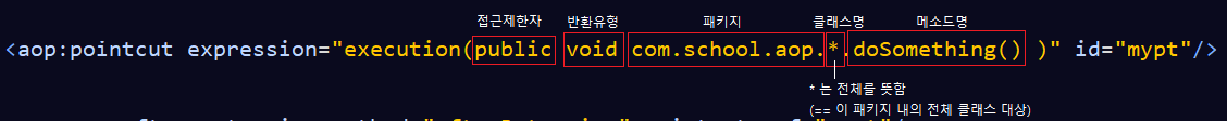 14번줄의 aop:pointcut은 expression의 조건에 걸리는 메소드들을 포인트컷으로 선언하겠다 라는 말입니다.