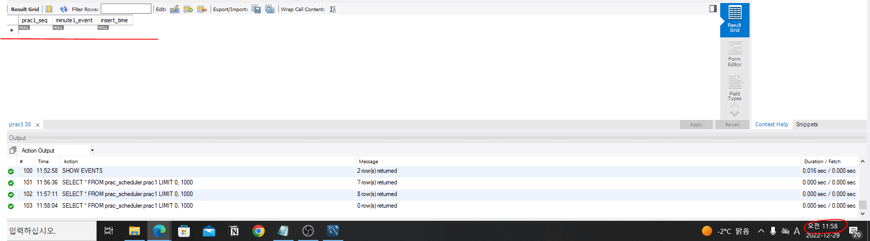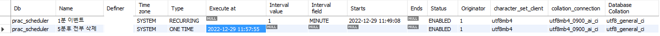 5분을 기다리는 동안 위에서 설명했던 이 SQL문을 실행시켜 이벤트가 잘 생성되었는지 확인합니다