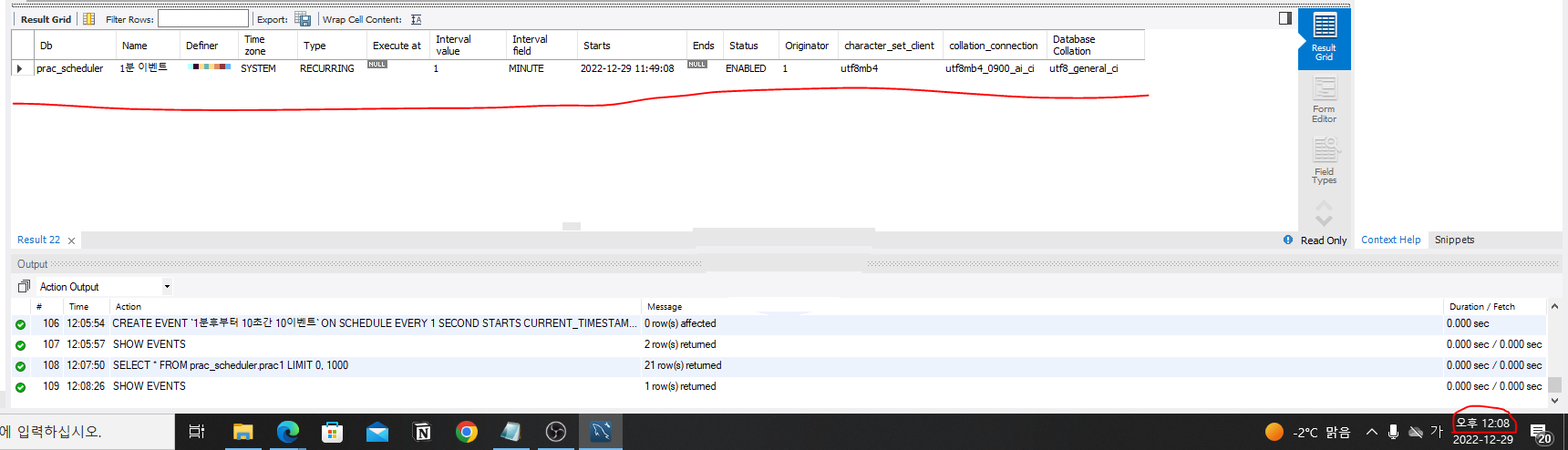 SQL문을 실행시켜 이벤트를 만든 시점이 12시 5분 54초 라는것을 알 수 있고