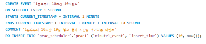 1분 후부터 10초간 1초마다 테이블에 10이라는 데이터를 넣는 이벤트를 만들어 봤습니다