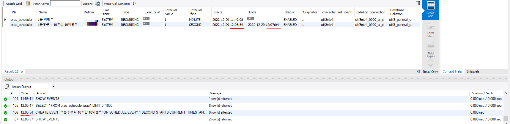 SHOW EVENTS를 해보면 1분후인 12시 6분 54초에 시작되고 12시 7분 4초까지 10초동안 실행 되는 것을 알 수 있습니다